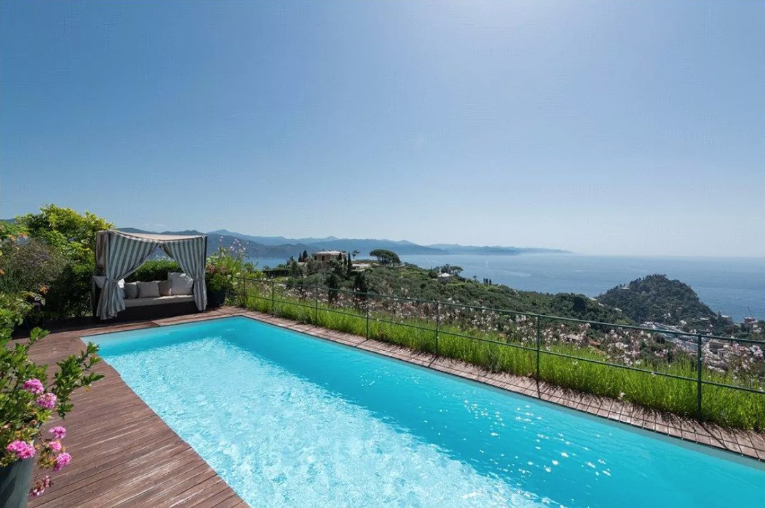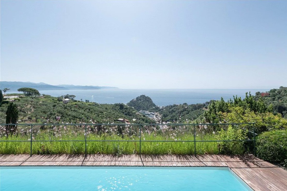 The swimming pool, dramatically set on the edge of the property, offers a breathtaking sensation of being suspended above Portofino, gazing out toward the endless horizon of the sea.