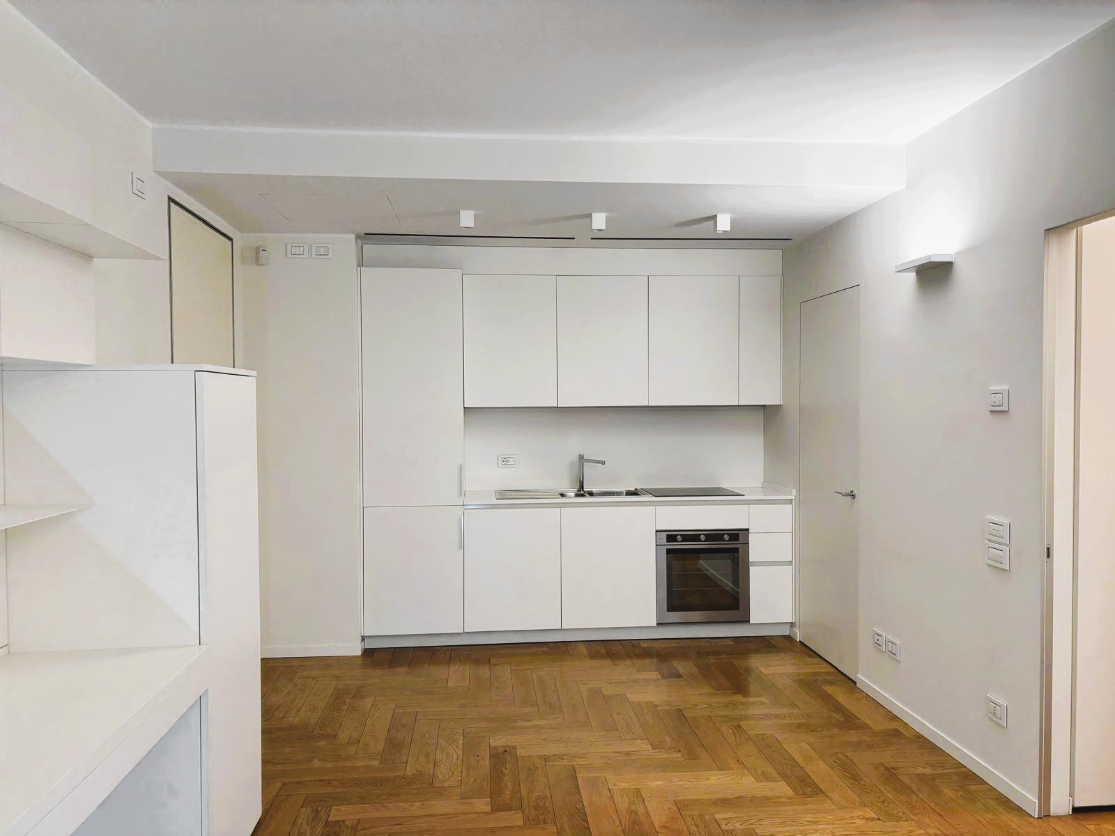 The apartment, elegantly furnished and overlooking the quiet, impeccably landscaped inner garden, comprises a bright living room with open-plan kitchen, bedroom, bathroom, and a practical storage room. Parquet flooring and state-of-the-art features — including a panel heating and cooling system with dehumidification, smart home technology, and A+ energy rating — ensure comfort and quality. The property is completed by a spacious cellar.