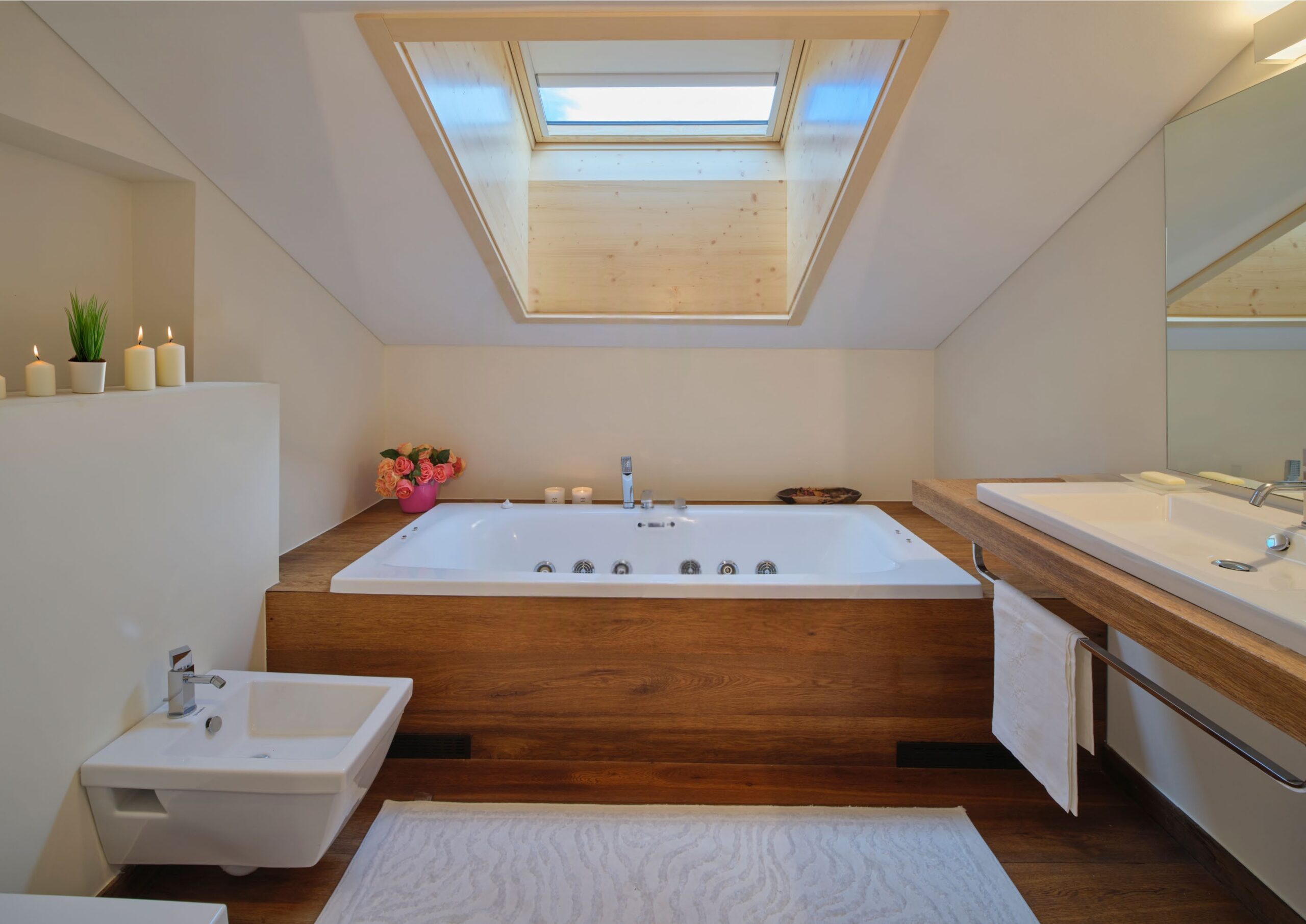 The upper floor hosts the master suite, complete with a luxurious bathroom featuring a Jacuzzi bathtub and separate shower, alongside a second bedroom with its own private bathroom, elegantly appointed with both shower and bathtub.