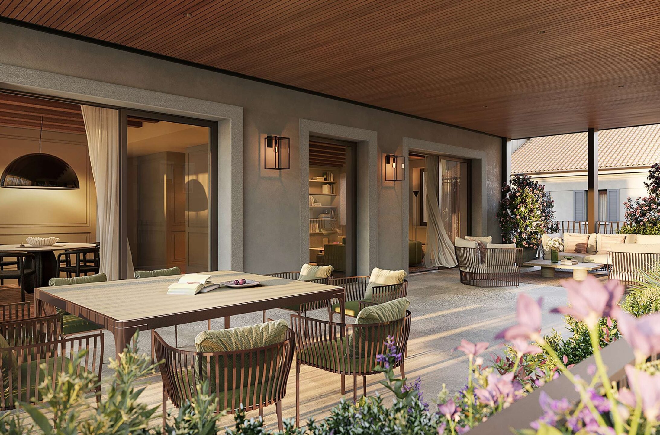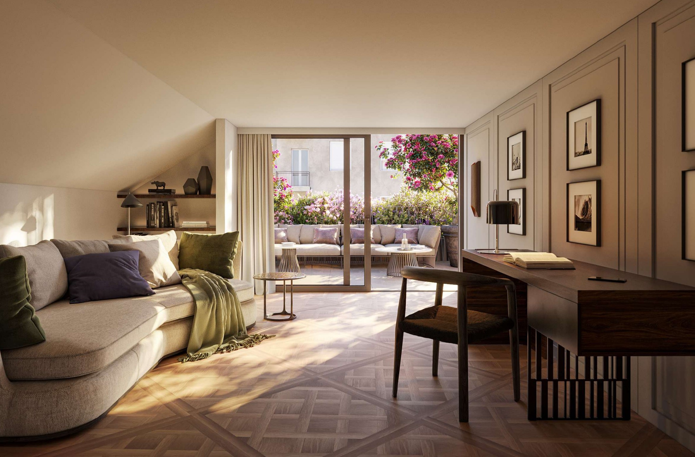 Surrounded by the tranquility of beautifully maintained communal gardens, the residence enjoys secluded views and an atmosphere of absolute privacy.