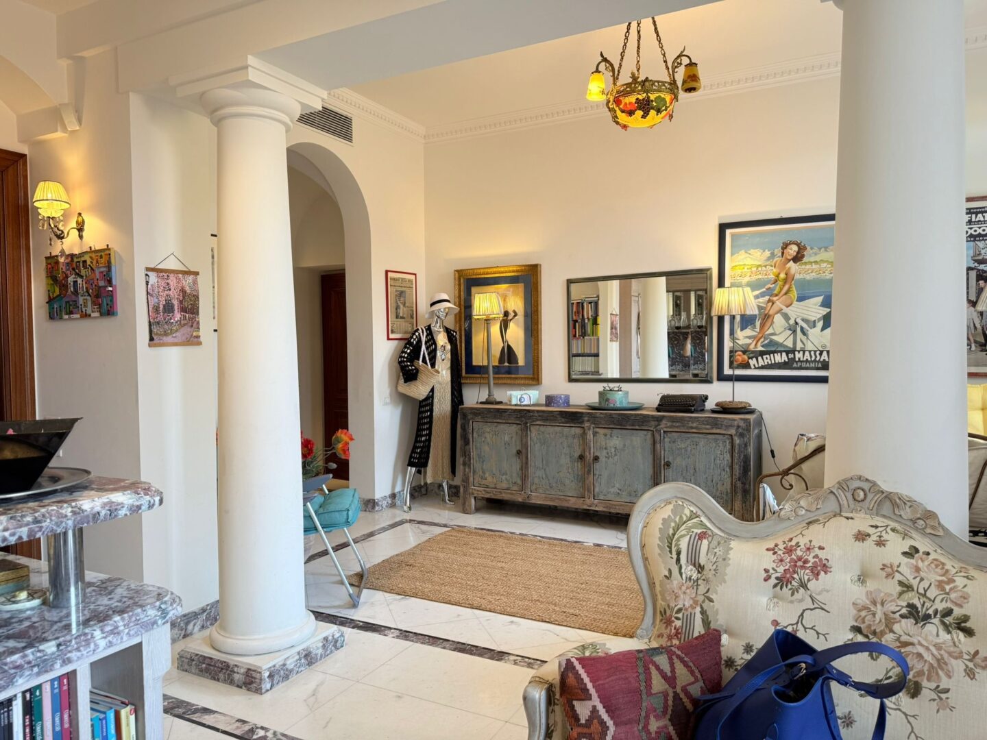 The residence includes double entrances, spacious reception rooms, a study, three bedrooms, a fully equipped kitchen with adjoining dining room, and well-appointed bathrooms. Balconies and a cellar complete the offering, along with a large garage and a private parking space.